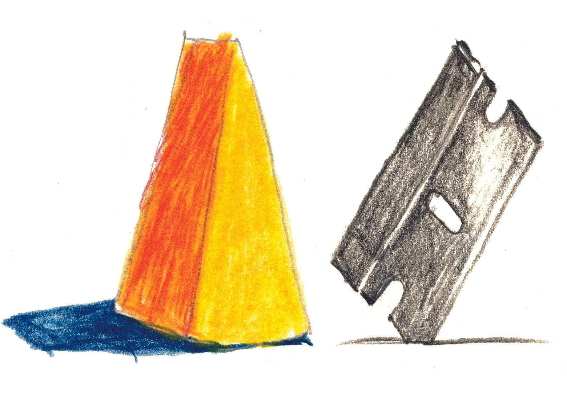 I looked at sharp knives, tongues, and the iconic single-edged razor blade. They all felt too obvious, but sharp cheese didn’t. It was sharp in taste and form. However, once I cut the cheese from paper, it fell flat. Fortunately, my earlier razor blade was the perfect foil—metal meets dairy.