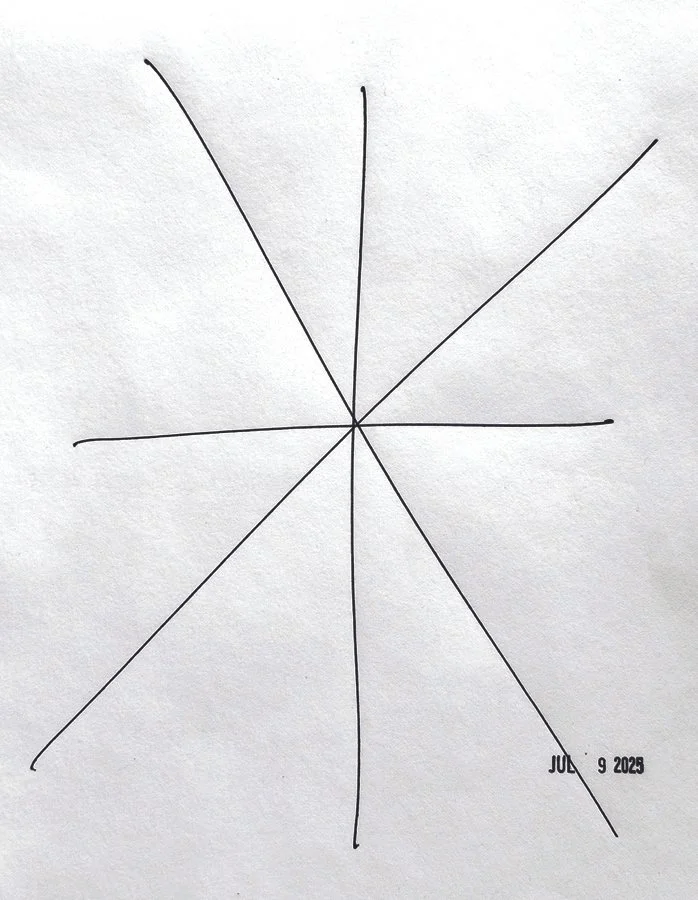Everything’s round, this was hard. 25 rotations with a compass holding a blue Micron 01, add a little colored pencil and done. It’s a beautiful object. I left the compass holes for proof. —cf