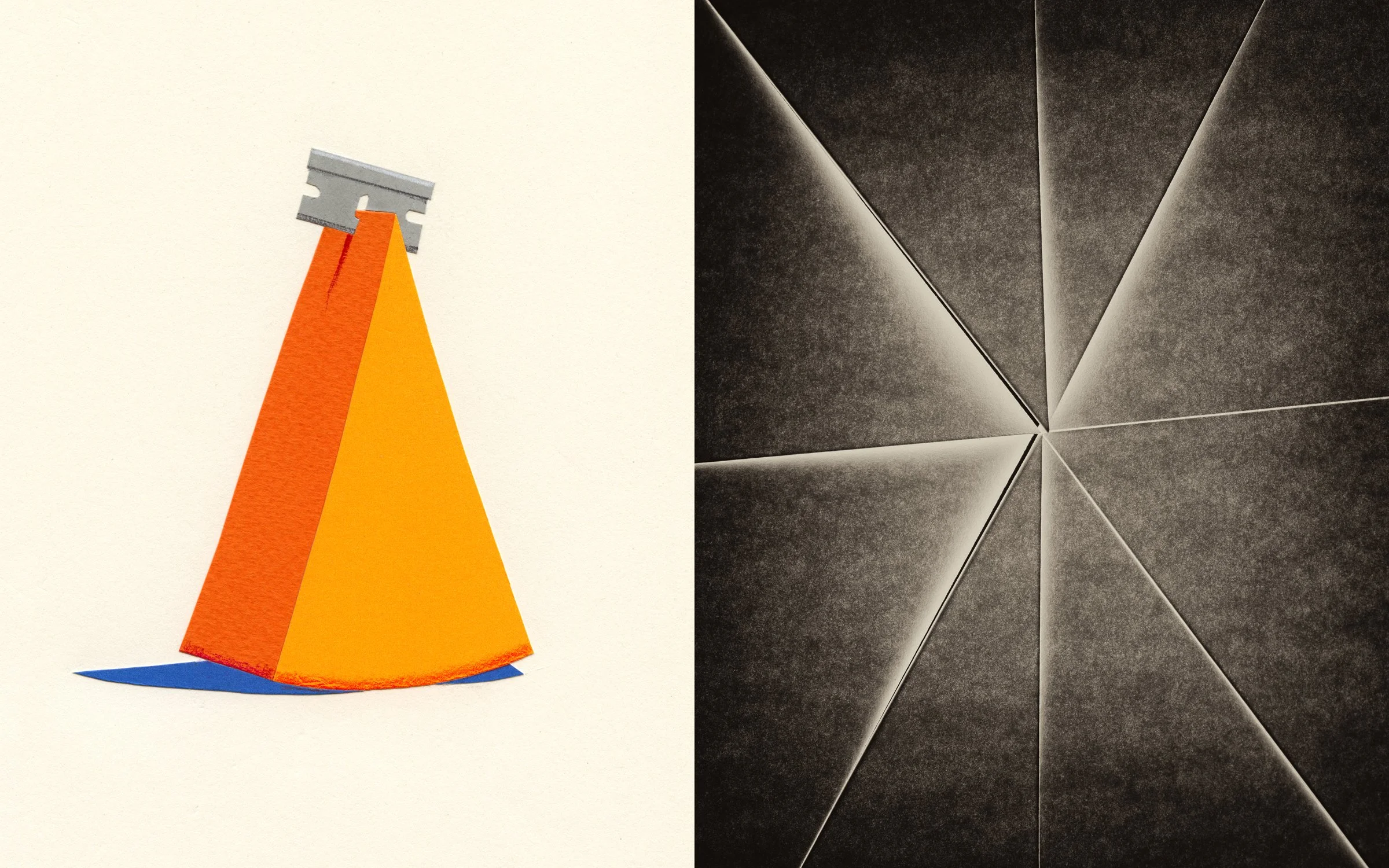 I have dozens of 30/60 and 45 degree triangles all over my studio—they are essential tools. The 45 is the most universal and visually perfect. It’s got a 90 and a 45 angle. I didn’t want to draw a triangle, I wanted to draw it’s effect. —cf