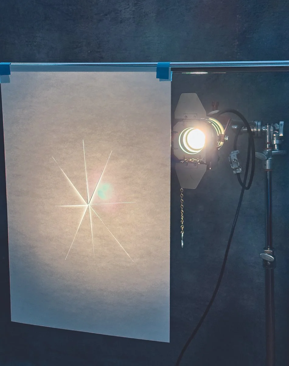 My first idea came from the hundreds of #11 Exacto blades I went through in art school. The rule was two cuts, then replace the blade. The second idea came to me in my sleep: cut a piece of paper with one singular center point and backlight it with one of my favorite lights, the “Mole-Richardson InBetweenie Solarspot.” It’s a simple Fresnel tungsten light that is no longer made. There is still something very sharp about tungsten light.